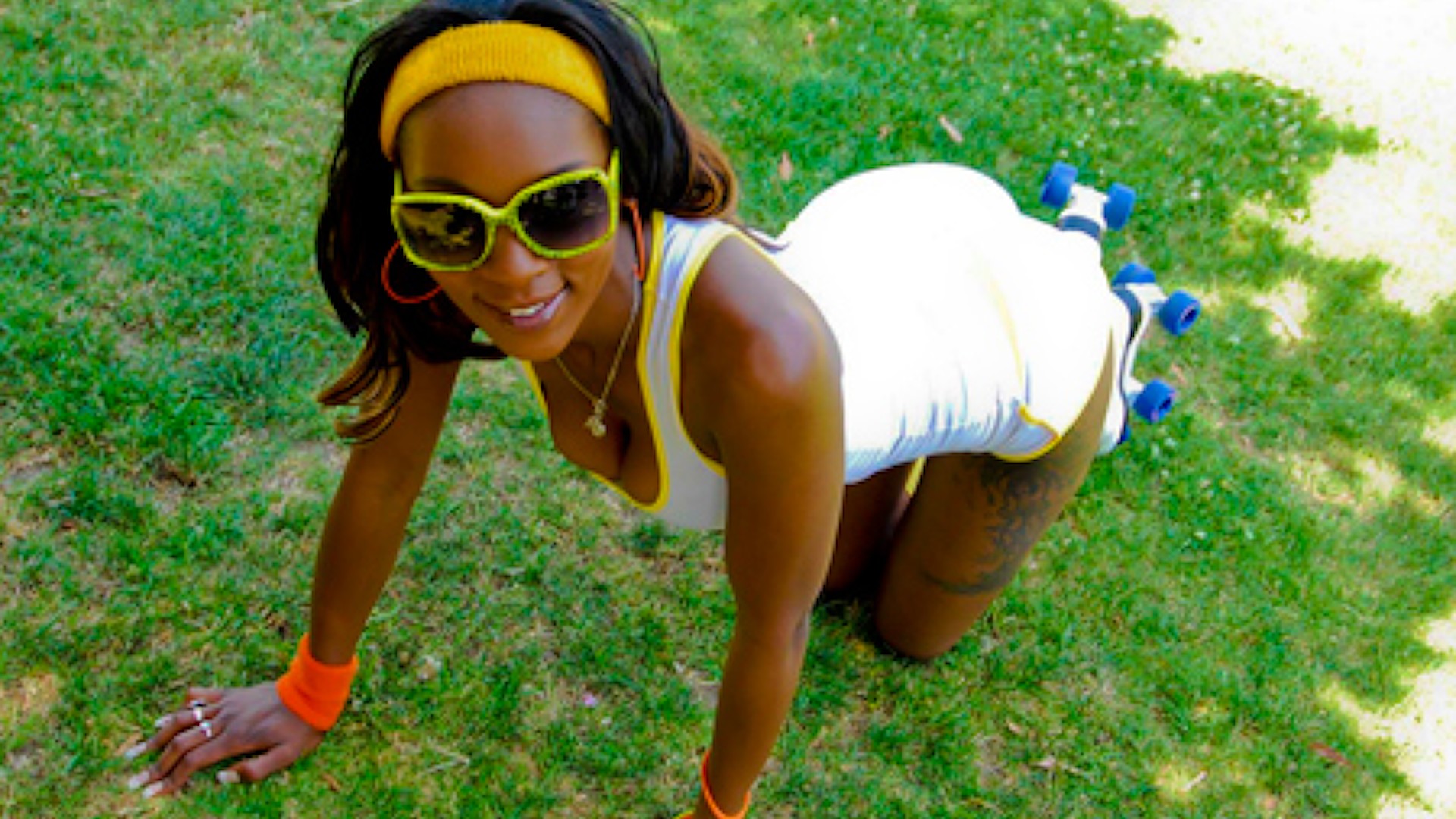 Erika hasn't been in a pair of roller skates in so long she's not sure how to do it anymore. She sure does look cute trying though. Her chocolate skin glimmers in the sun making you want to lick the sweat right off her in the hopes that maybe it tastes sweet. After some play in the park it's time for some play the part and she gets it on with a young Cali fellow back at her house. She can fuck! It's great to see two people get it on after a day at the park. She has a fat booty with tatted up legs. Her tits are natural and are great to shuv your face in. The view at her house is incredible and inspires fun like this for sure. Enjoy!